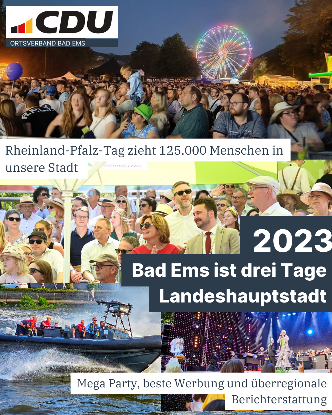 Der Rheinland-Pfalz-Tag 2023 war das Highlight des vergangenen Jahres. Nach 2005 war Bad Ems bereits zum zweiten Mal Ausrichter! Im Dezember 2020 hat der Stadtrat mit einer überwältigenden Mehrheit für die Ausrichtung gestimmt. Die Stadt Bad Ems hat sich am Landesfest Binder besten Seite verkauft. Ministerpräsidentin Malu Dreyer bezeichnete den Rheinland-Pfalz-Tag in Bad Ems als das „womöglich charmanteste Landesfest in der Geschichte“. Wir haben uns in diesen Tagen von der besten Seite verkauft. Es war sicherlich das unangefochtene Highlight des Jahres und die rund 125.000 Besucherinnen und Besucher werden noch lange an diese fröhlichen Tage und die vielen Darbietungen denken. Auf dem Rheinland-Pfalz-Tag 2023 in Bad Ems gab es eine Vielzahl von Veranstaltungen, darunter Konzerte mit Stars aus den Charts sowie einer Liveshow des SWR im Fernsehen, kulturelle Aufführungen, kulinarische Angebote, traditionelle Handwerksvorführungen, sowieso Informationsstände von Unternehmen und Organisationen aus der Region sowie der Blaulichtfamilie und des Militärs. Es war eine Gelegenheit, die Vielfalt und das kulturelle Erbe des Bundeslandes Rheinland-Pfalz zu feiern. Danke an unsere Mitveranstalter, der Verbandsgemeinde Bad Ems-Nassau und dem Land Rheinland-Pfalz. Dies war ein einmaliges Erlebnis!