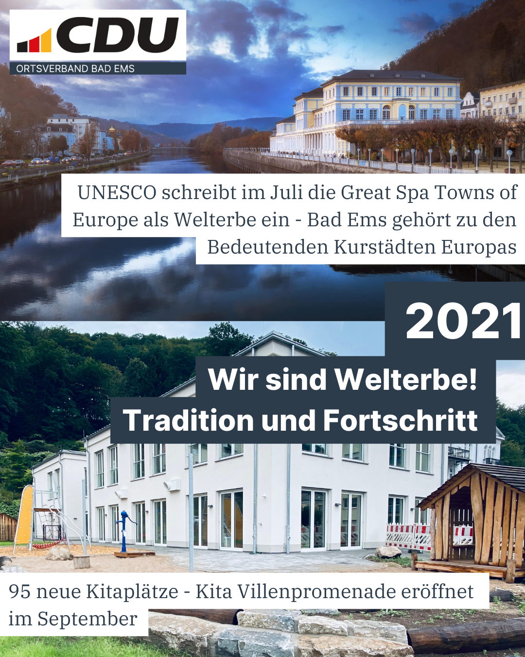 Das Jahr 2021 ging in die Geschichtsbücher unserer Stadt Bad Ems ein. Für die 44. Sitzung des Welterbekomitee im chinesischen Fuzhou waren 36 Stätten zur Neuaufnahme auf die UNESCO-Welterbeliste nominiert und dies weltweit. Darunter auch eine transnationale Bewerbung unter dem Titel "Great Spas of Europe". In Bad Ems im historischen Marmorsaal verfolgte man am 24.07. ab 12:30 Uhr - einem Samstag - aufmerksam in einer Live-Übertragung die Geschehnisse. Interessierte Bürgerinnen und Bürger sowie Gäste aus Politik und Verwaltung verfolgten gespannt die Sitzung. Als die "Great Spas of Europe" an die Reihe kamen, wurde die Bewerbung von unseren Vertretern und dem damaligen Generalsekretär Paul Simons kurz vorgestellt. Bis auf die Bezeichnung der Bewerbung gab es keine Beanstandungen, was für die jahrelange und gute Vorbereitung durch die elf Städte spricht. Lediglich schlug das Komitee eine Änderung der Bezeichnung vor. Es empfahl die Ergänzung des englischen Worts "tonws" (dt. Städte), damit die Beziehung zu den Städte deutlicher wird. Die Vertreter der "Great Spas" widersprachen nicht. Daher führt die eingeschriebene transnationale Welterbestätte heute die Bezeichnung " Great Spa Towns of Europe ". Das ganze Prozedere dauerte wenige Minuten, als der Sitzungspräsident den Hammer auf den Holzteller am Sitzungstisch fallen lies und das Wort "inscribed" (dt. eingeschrieben) aussprach, schauten sich alle Anwesenden verdutzt an. "Das war es schon?", fragte Stadtbürgermeister Oliver Krügel einen anwesenden Vertreter aus Mainz. Dieser nickte bejahend in Richtung der Bad Emser. Danach kannten der Jubel und die Freude kein Halten mehr! Diese wenigen Minuten vom Aufruf der Bewerbung zur Einschreibung sprechen für die gute Vorarbeit aller verantwortlichen Mitarbeiter in den Bäderstädten. Einer dieser Personen war der damaligen Bad Emser Stadtarchivar und Projektleiter Dr. Hans-Jürgen Sarholz, der sich mit einer Delegation aus den deutschen " Spa Towns" bei der bundesverantwortlichen Stelle für alle deutschen Welterbestätten in Berlin befand und von dort aus das Geschehen in China verfolgte. Bad Ems gehört seit diesem Tag der transnationalen Welterbestätte von 11 Kurstädten aus 7 europäischen Ländern an, weil es eines der mondänen internationalen Kurorte war und sich dies auch bis heute aus der hervorragend erhaltenen Bausubstanz sowie der Anordnung und Beziehungen der Kureinrichtungen ersichtlich ist. Im Kern befindet sich das Kurhaus, wo heute das Grandhotel direkt über den Heilquellen steht. Es sind heiße Quellen und heute sind 15 davon in Bad Ems bewirtschaftet. Auch ein Aspekt der Welteranerkennung der Bedeutenden Kurstädte Europas (die deutsche Bezeichnung der transnationalen Welterbestätte) - ist die sogenannte gelebte Tradition (living tradition). Für Bad Ems ist dies unter anderem die Nutzung der Quellen sowie die Herstellung der berühmten Emser Pastille, die bis heute andauern. "Bei Erkältung erstmal Emser", ist ein bekannter Werbeslogan, der für die aus dem Emser Salz hergestellten Produkte wirbt. Die Stadtpolitik hat den Prozess in drei Wahlperioden durchweg positiv begleitet. Großer Dank gebührt dem Projektleiter Dr. Hans-Jürgen Sarholz, der diese historische Chance für Bad Ems außerhalb politischen Geplänkels erkannt, sachlich begleitet und im Hintergrund die maßgebliche Arbeit geleistet hat. Wir werden uns auch weiterhin für den Erhalt und die Vermittlung des Welterbes einsetzen, denn dies ist ein fortwährender Prozess und wir erachten dies als große Verantwortung aber auch Chance für unsere Stadt - heute und in Zukunft! Die Errichtung der Kita Villenpromenade war ein wichtiges Projekt zur Erweiterung des Kitaplatz-Angebots und damit für ein familienfreundlicheres Bad Ems. Dieses wurde baulich komplett in der jetzigen Wahlperiode umgesetzt, nachdem über einige Jahre in der Stadtpolitik immer wieder über Attribute des Gebäudes oder die Sinnhaftigkeit diskutiert wurde. Mit dem Spatenstich im September 2019 ging es gleich zu Beginn der Wahlperiode los. Eröffnet wurde die moderne Einrichtung Ende September 2021 nach rund zwei Jahren Bauzeit. 3,9 Millionen Euro kostete der Bau, die Stadt Bad Ems schulterte 71% der Kosten, die Förderungen von Land und Kreis beliefen sich demnach auf 1,15 Mio. Euro. Heute können in der Einrichtung auf dem alten Gelände des Hotels Balzer rund 95 Kinder betreut werden. Für die Attraktivität der Stadt als Wohnstandort von wichtiger Bedeutung!